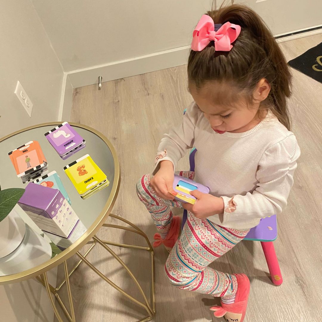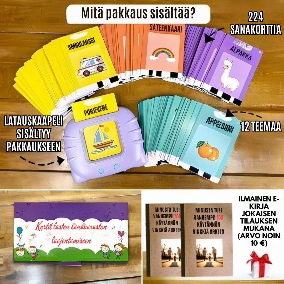 Kortit sisältävät arkipäiväisiä esineitä, joihin taaperot ja esikouluikäiset lapset törmäävät päivittäin – kuten hedelmiä, esineitä, ajoneuvoja ja värejä. Näin lapsesi voi oppia helposti 224 uutta sanaa ja laajentaa sanavarastoaan luonnollisella ja hauskalla tavalla.
